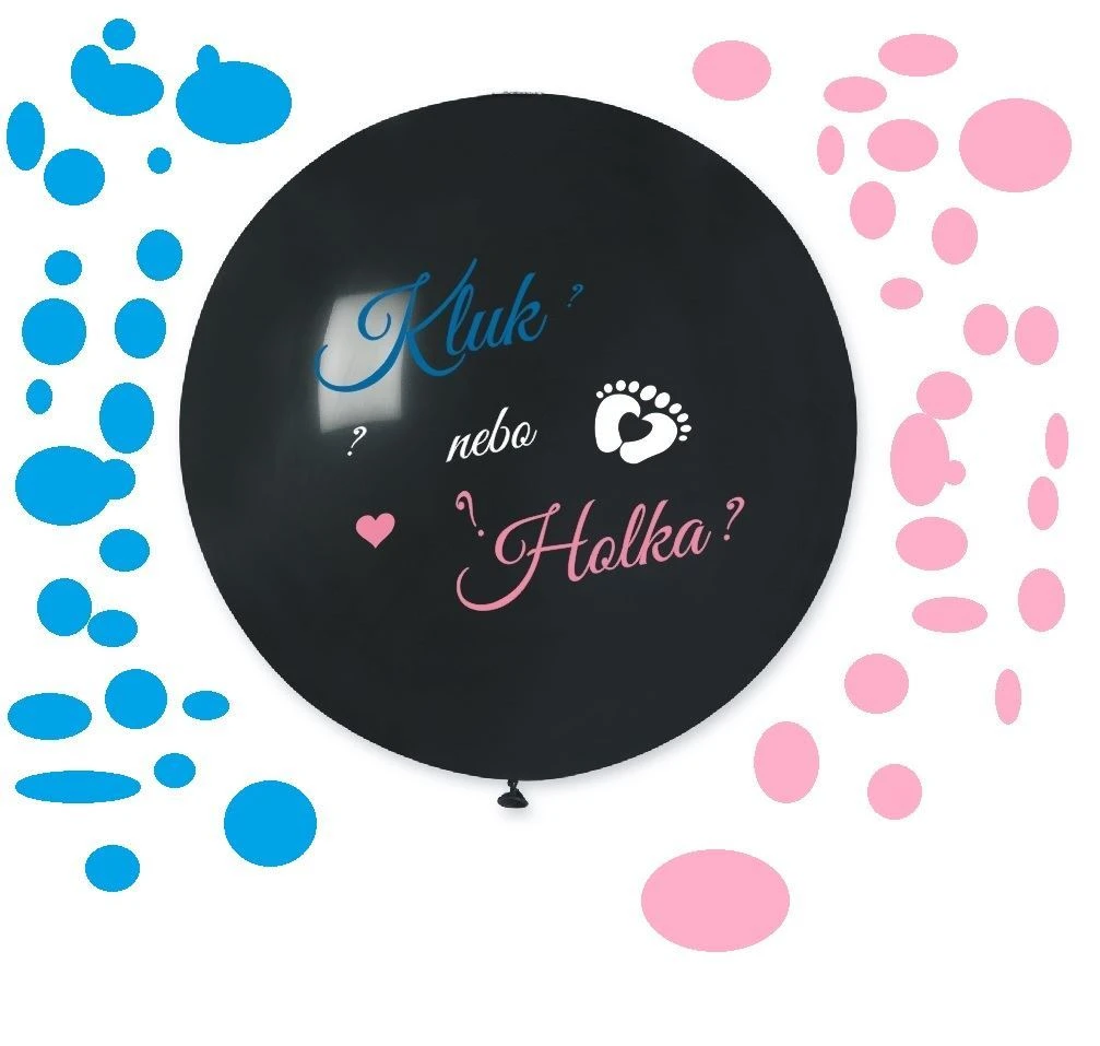 Sada obsahuje jeden černý balónek 80 cm s nápisem "Kluk nebo holka?" a růžové i modré konfety, kterými naplníte balón podle toho, jestli se narodí holčička nebo chlapeček.