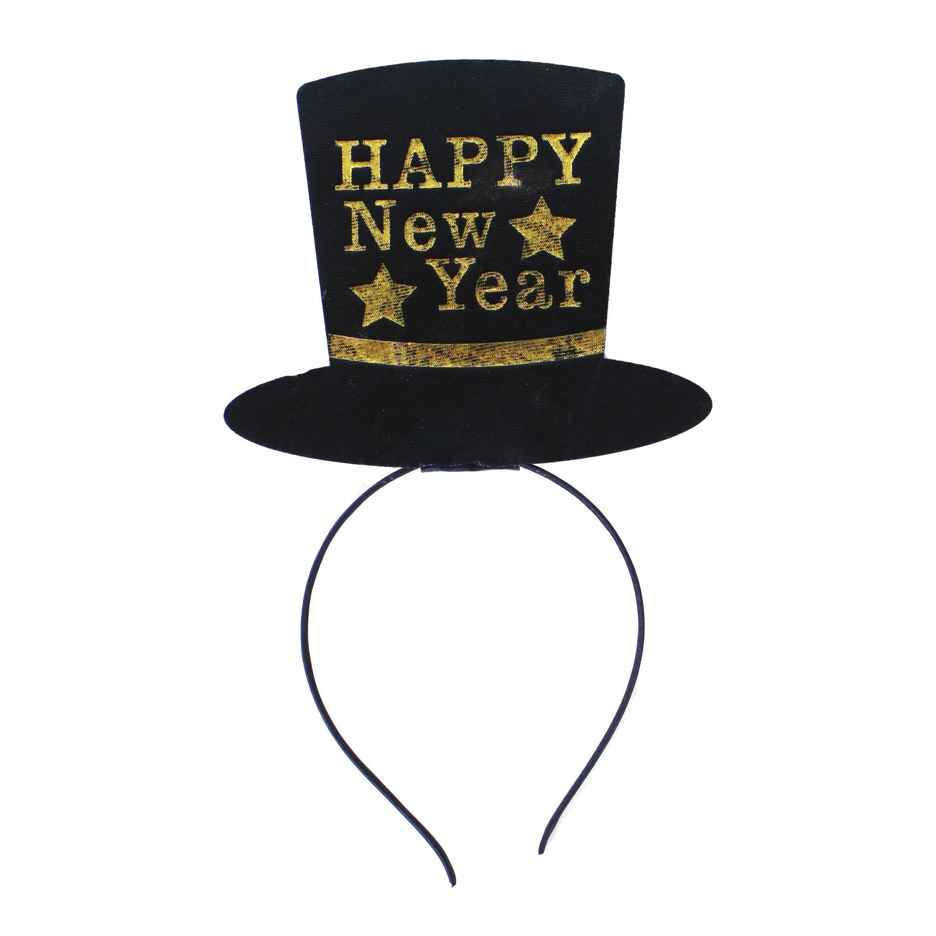 Černá čelenka s kloboučkem, doplněná zlatým nápisem HAPPY New Year - Silvestr je senzačním doplňkem na oslavu nebo večírek při vítání Nového roku!