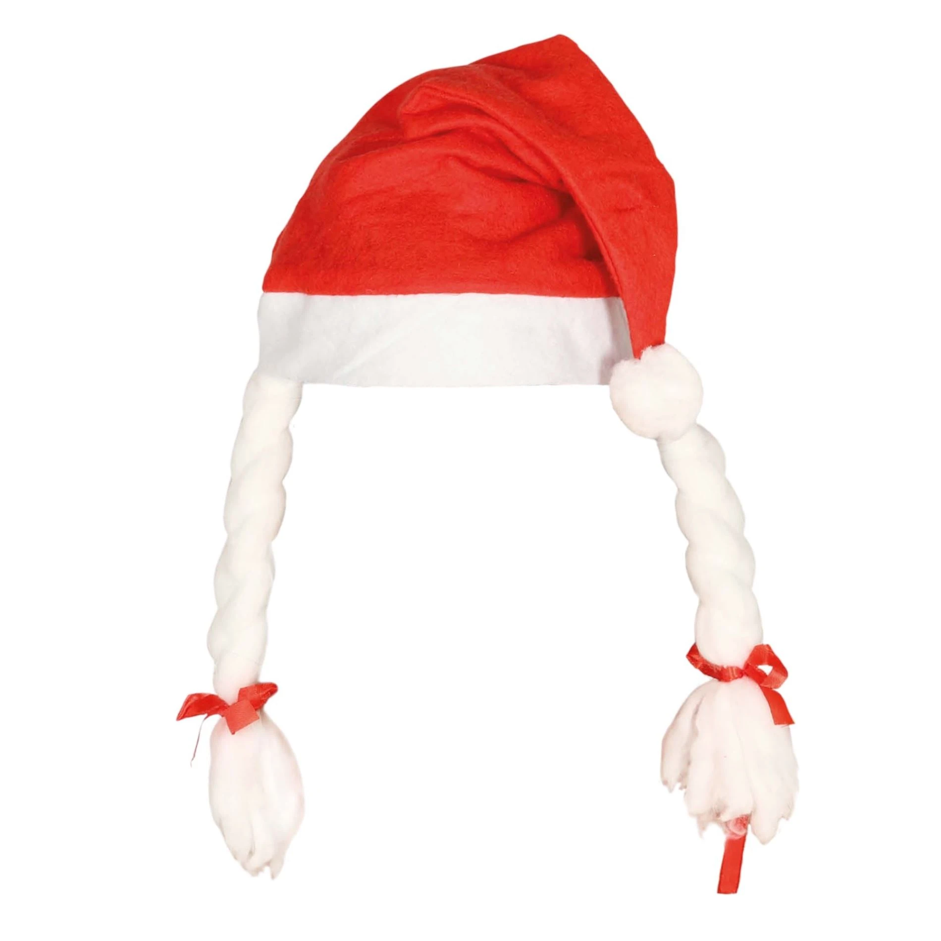 Roztomilá dámská vánoční čepice zdobena sněhově bílýmí copánky s mašličkami je vyrobena z materiálu filc.