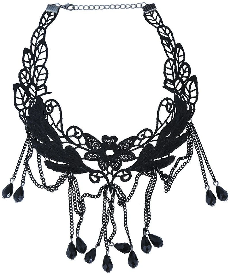 Černý náhrdelník s květinami a kameny - Halloween