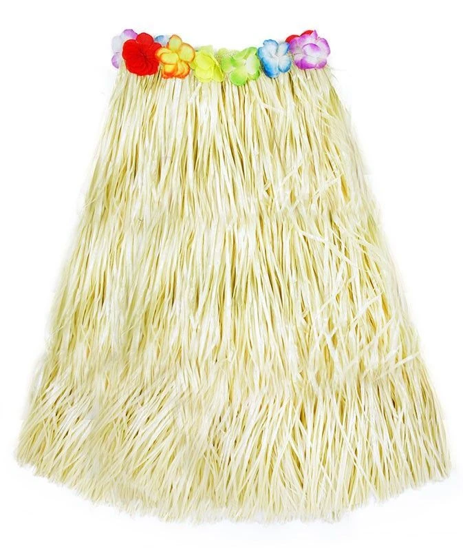 - Havajská sukně o délce 72 cm, vyrobená z lehkých igelitových pásků v přírodní barvě