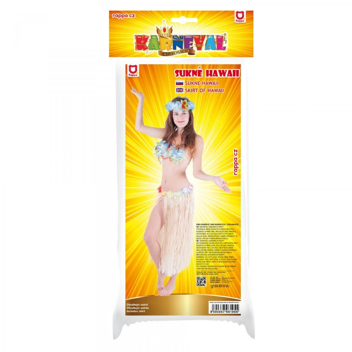 Balení zahrnuje 1x havajskou sukni. Ostatní doplňky (náhrdelník, čelenka, náramky) si můžete vybrat zvlášť v naší nabídce a sladit vše do kompletního havajského kostýmu.