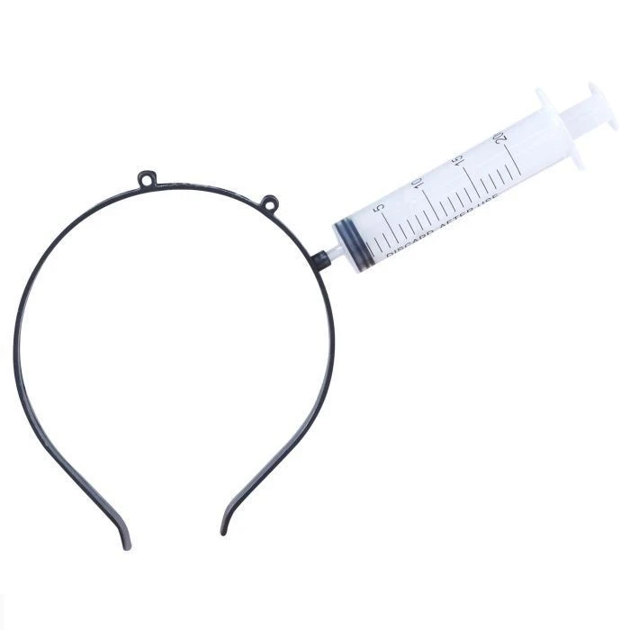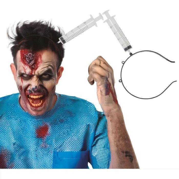 Injekční stříkačka zabodnutá v hlavě je morbidní doplněk na halloween nebo hororovou párty. Stříkačka může posloužit jako dekorace na doktorsky tematizované párty nebo jako doplněk ke kostýmu šílené sestřičky