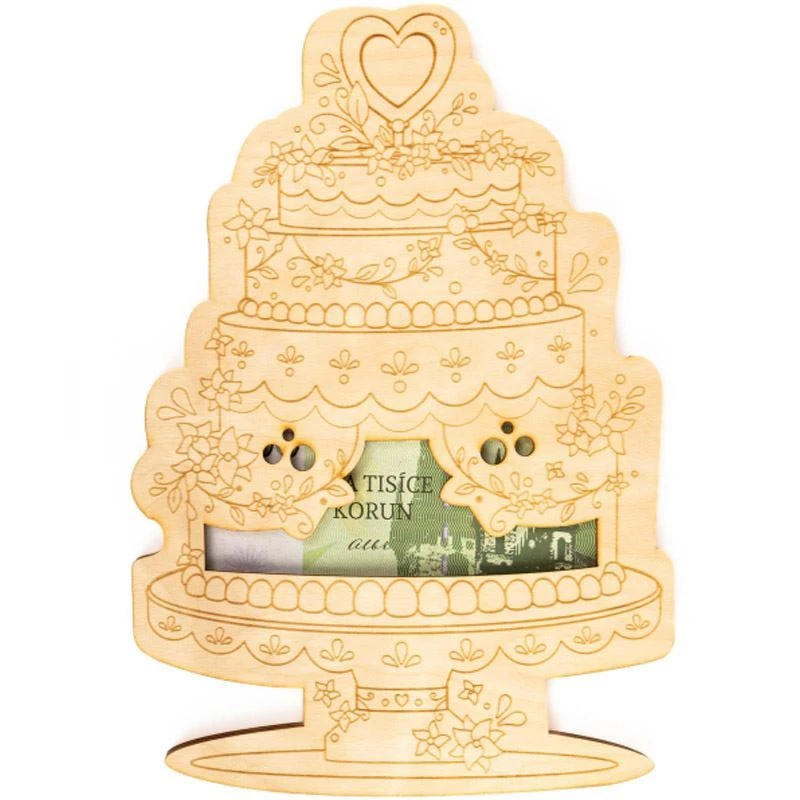 Dárková dřevěná kapsa na peníze ve tvaru svatebního dortu umožňuje darovat bankovky nevšední cestou.