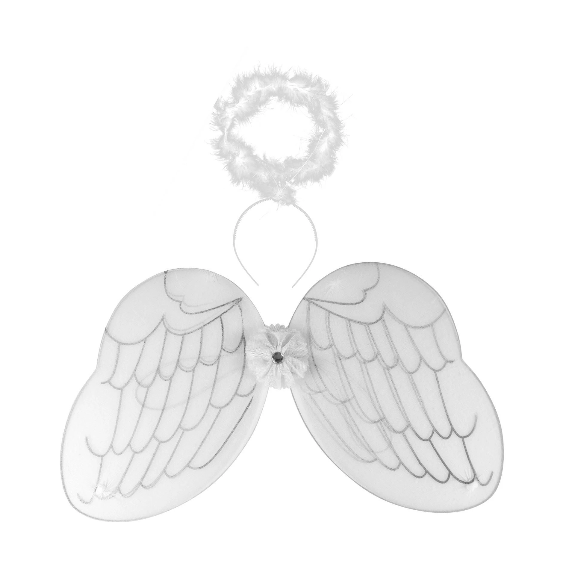 Krásná sada andělských křídel se stříbrným zdobením olemovaná peříčky zároveň obsahuje i krásnou čelenku se svatozáří také vyrobenou z peříček. Pozor! Sada obsahuje pouze křídla a čelenku!