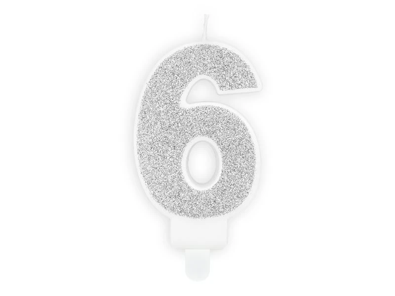 Velmi elegantní stříbrná svíčka ve tvaru čísla 6, nesmí chybět na žádném narozeninovém dortu.