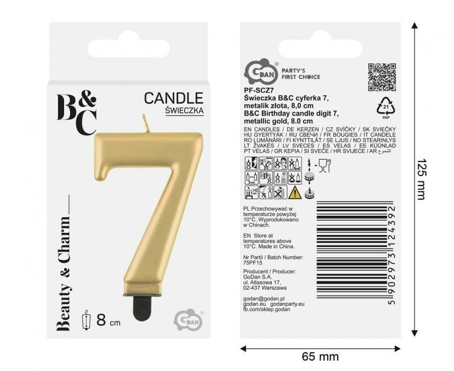 Narozeninová svíčka na dort – číslo 7, metalická zlatá (8 cm)