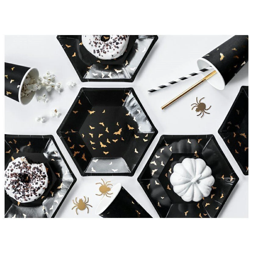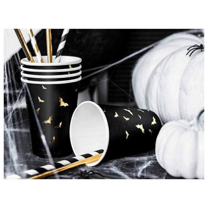 Papírové kelímky v černé barvě se zlatým potiskem netopýrů, vhodné na halloweenskou párty!