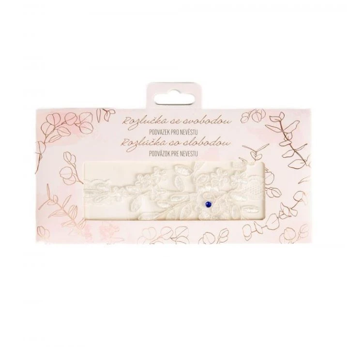 Jemný bílý podvazek pro nevěstu s korálkem v modré barvě naplňuje krásnou tradici, při které by nevěsta měla mít na sobě něco nového a modrého, a navíc nevěstě uděláte v podobě dárku určitě velkou radost.