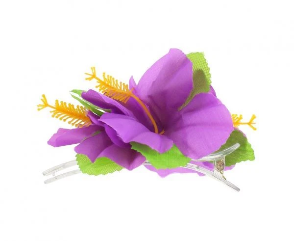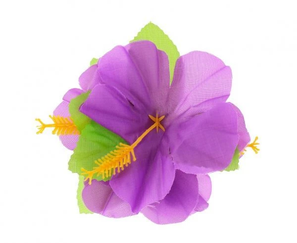 Havajská spona do vlasů – fialový květ ibišku. Ozdoba na hajskou párty, která nesmí chybět žádné ženě ve vlasech. Kromě toho lze kvítek použít také jako tématickou dekoraci na vašem večírku.