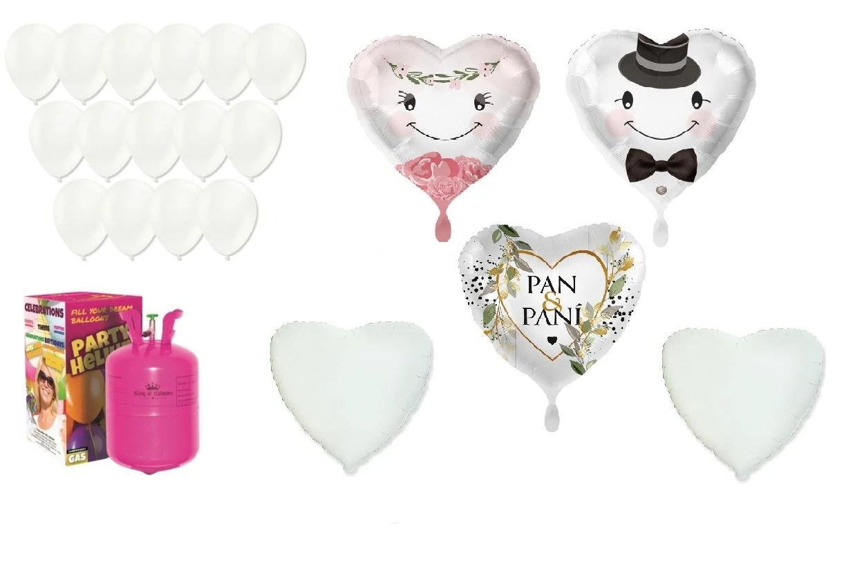 Sada obsahuje 1 ks jednorázové láhve helia (tlaková láhev o vodním objemu 13,4 l obsahuje 400 l stlačeného helia) + 15 ks latexových bílých balonků s průměrem 25 cm a 5 ks foliových balonků o průměrech ( 5ks o průměru 45 cm).