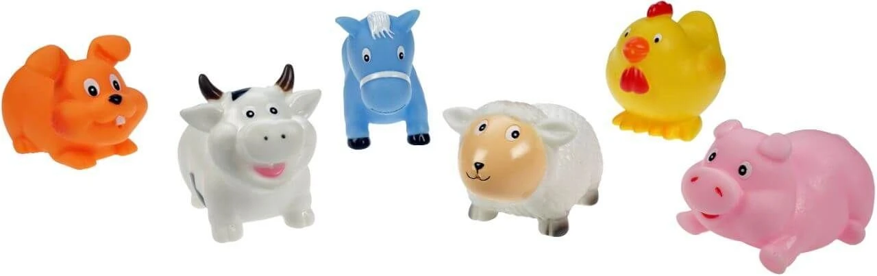 Gumová stříkací zvířátka: králíček, oslík, prasátko, kravička, ovečka, kuřátko. Cena za jeden kus. Jednotlivé druhy na dotaz